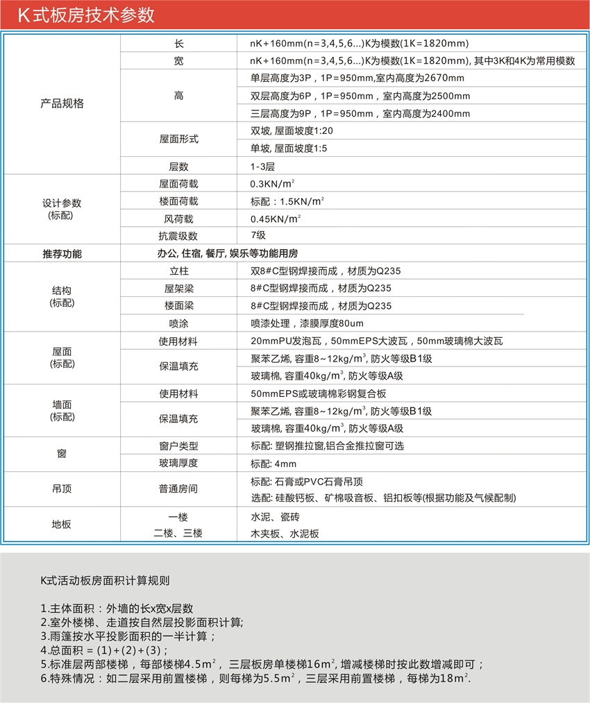 安全稳固——抗震烈度达7级,能抗强风10级下,楼面荷载1.5kN/㎡,屋面荷载0.3kN/㎡;